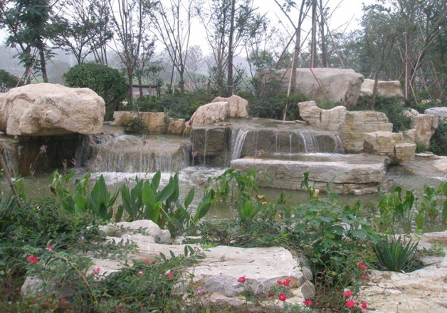 6.真材(天然石材)、假料(GRC等)配合的造型設(shè)計(jì),不失為一種良策,一種革新。尤其在施工困難的轉(zhuǎn)折、倒掛處,在人接觸不到的地方,使用人造假山,往往可以少占空間,減輕荷重,而整體效果好。CRC材料特別要注意玻璃纖維的質(zhì)量,造價(jià)如以800元/平方米計(jì),和真材也相差無(wú)幾。