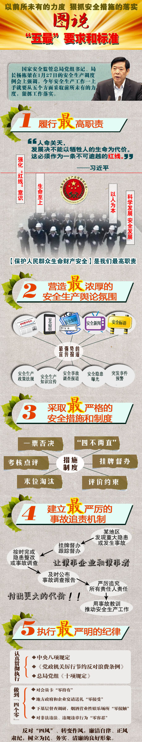 國(guó)家安全監(jiān)管總局黨組書(shū)記、局長(zhǎng)楊棟梁在1月27日的安全生產(chǎn)調(diào)度例會(huì)上強(qiáng)調(diào),2014年安全生產(chǎn)工作一上手就要從五個(gè)方面采取前所未有的力度,狠抓工作落實(shí)。