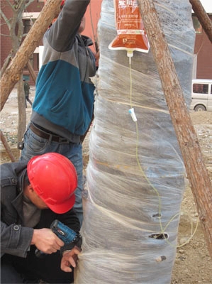 技術(shù)人員首先用電鉆在樹干根頸部位45°角鉆開一個小孔,然后將輸液管插入其中,將輸液瓶吊于樹上,吊瓶中的液體通過輸液管流進樹干中。輸液瓶里富含植物所需的各種營養(yǎng)成分以及微量元素,項目部針對樹況的不同適時添加殺菌劑和殺蟲劑。