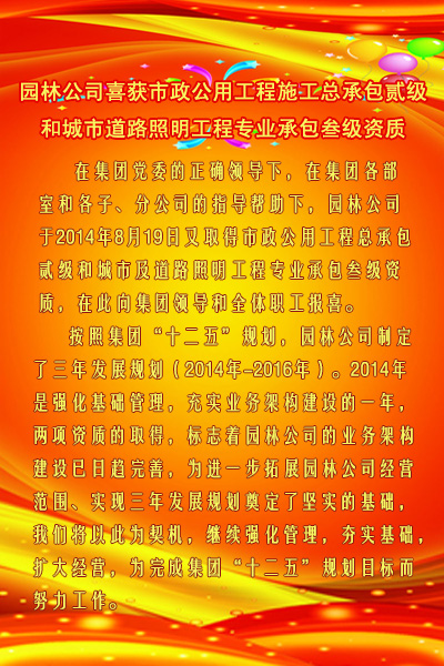 園林喜獲市政公用工程施工總承包貳級和城市道路照明工程專業(yè)承包叁級資質(zhì)