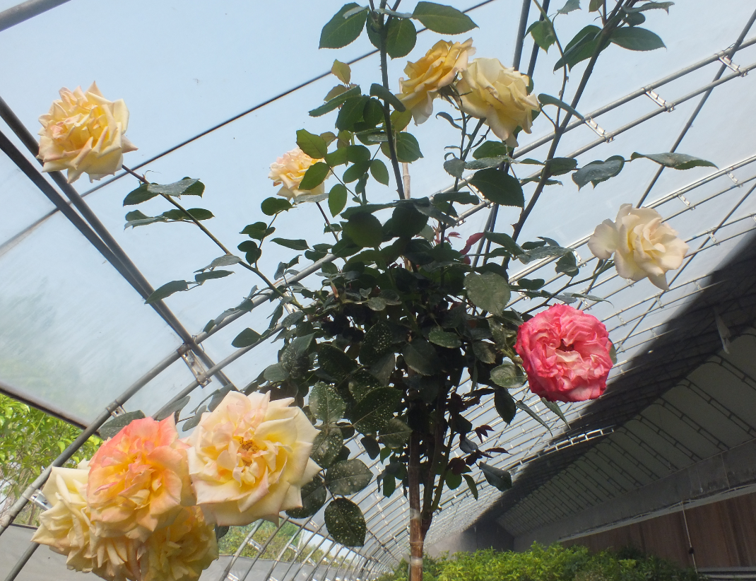 由匯友市政園林集團(tuán)自行繁殖的光譜月季在溫室棚里盡情的綻放自己。溫室的溫度讓月季花搶先爭艷,五顏六色的月季花給大