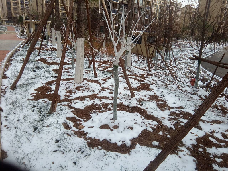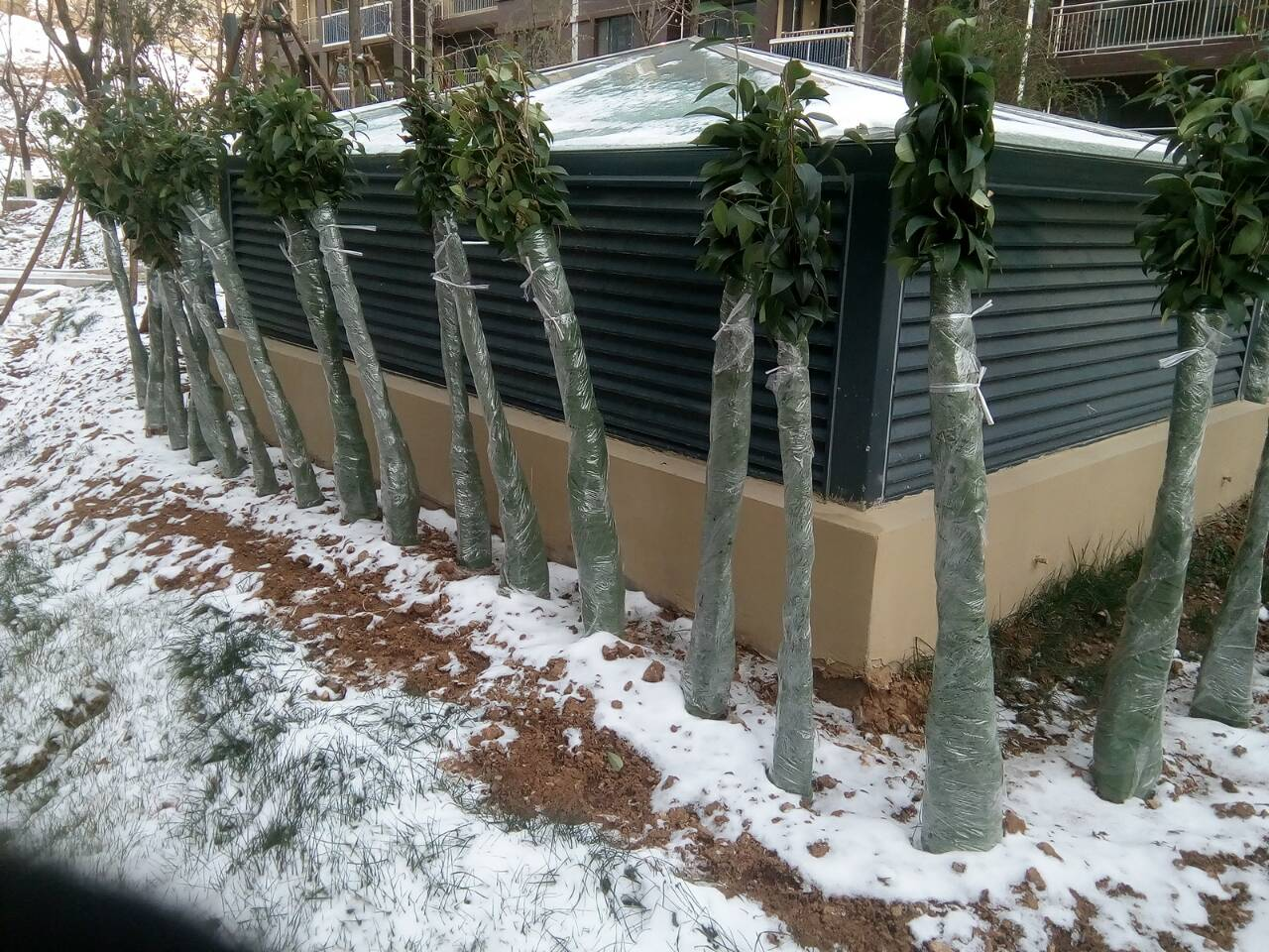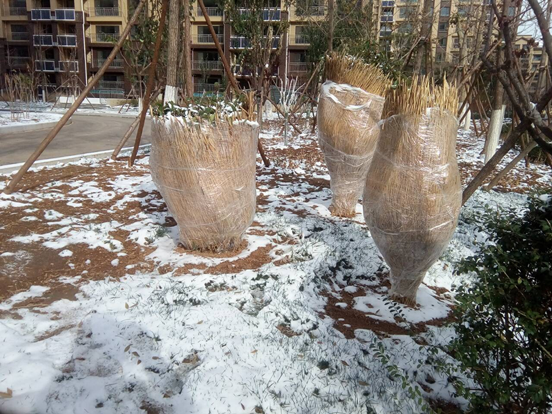 對(duì)苗木進(jìn)行涂白,使樹木不會(huì)因晝夜氣溫劇變受到影響;苗木覆草,霜凍到來(lái)之前,用干稻草、草席等對(duì)苗木完全包裹起來(lái),次春撤除;項(xiàng)目部根據(jù)各種苗木習(xí)性對(duì)苗木進(jìn)行精細(xì)養(yǎng)護(hù),保障苗木順利越冬。