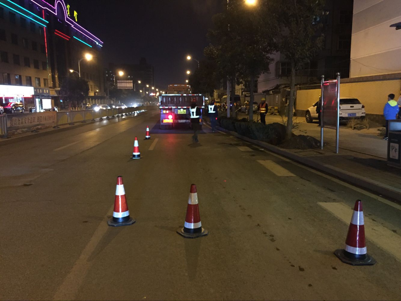 匯友市政園林集團順時安排下去,由分公司副經理王紅磊統籌安排,項目經理謝艷清進行人員調動與現場施工。接到本次任務已是下午三時,較短時間的組織機械、籌備隊伍進行工程策劃對淡季的園林公司來說比較棘手,材料設備部與安全環保部的完美配合,不到2個小時的時間機械、物資、人力都全面到位等待夜間施工的到來。