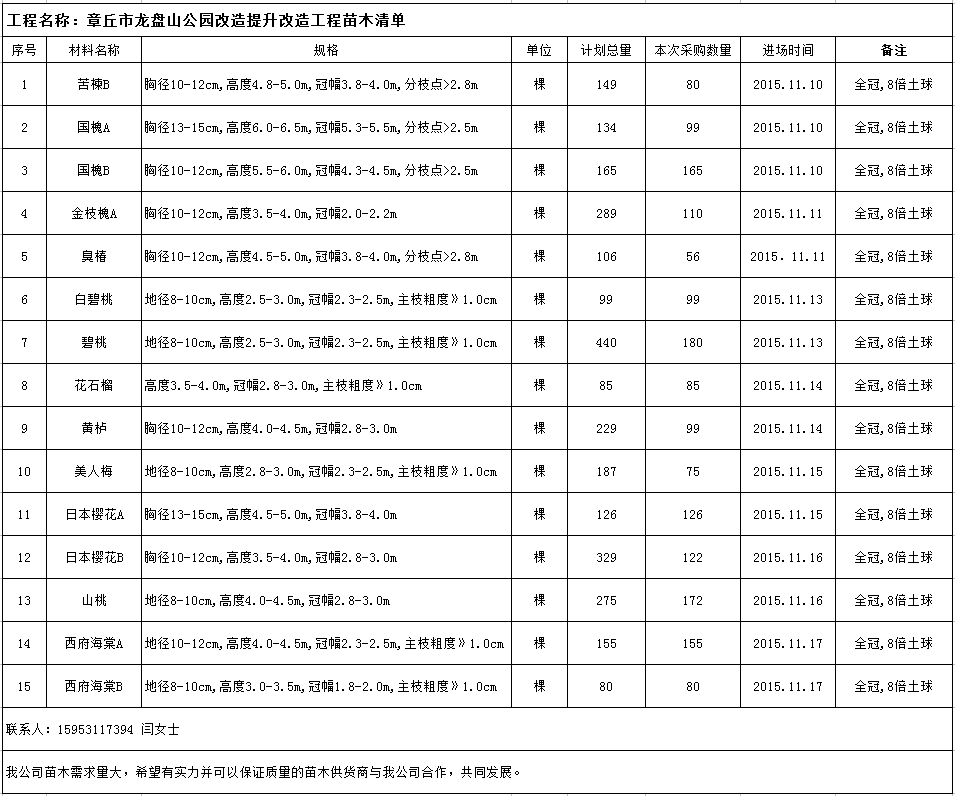 匯友園林秋季外購苗木清單